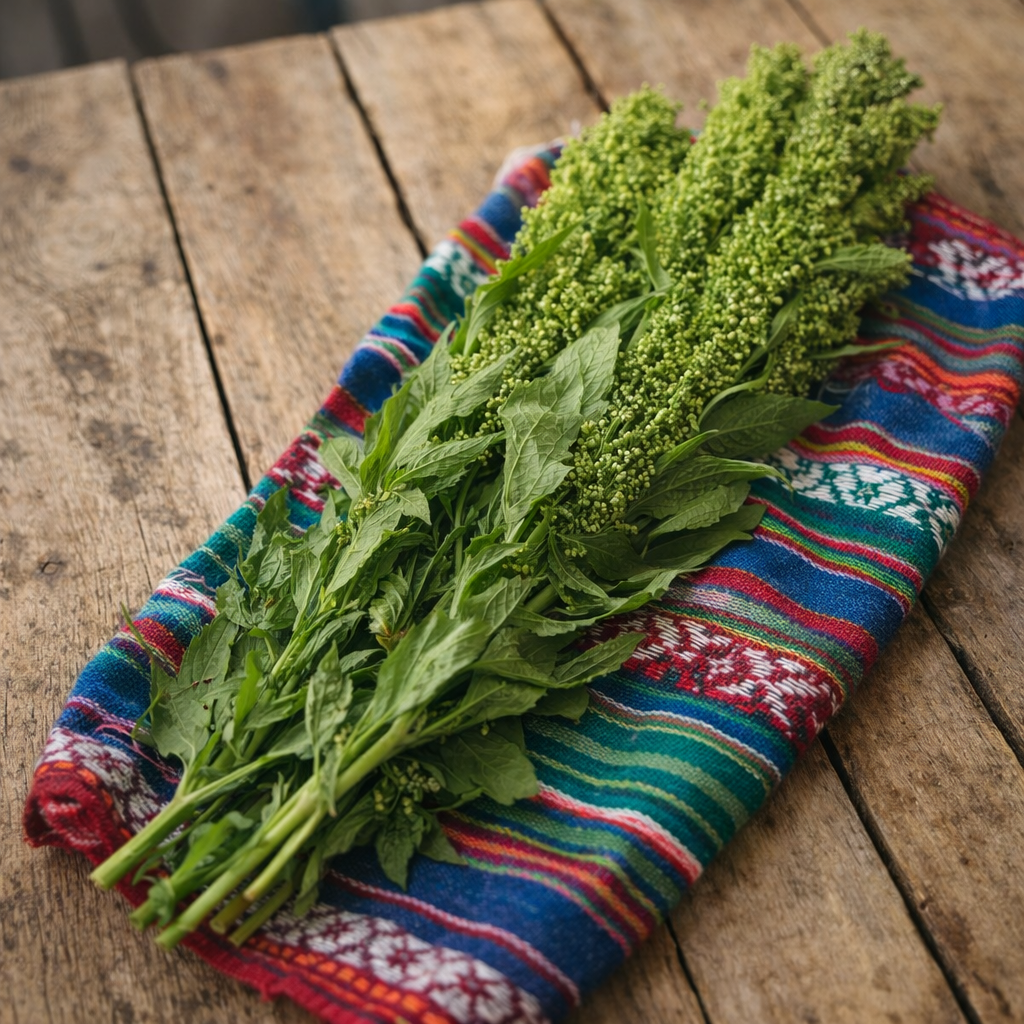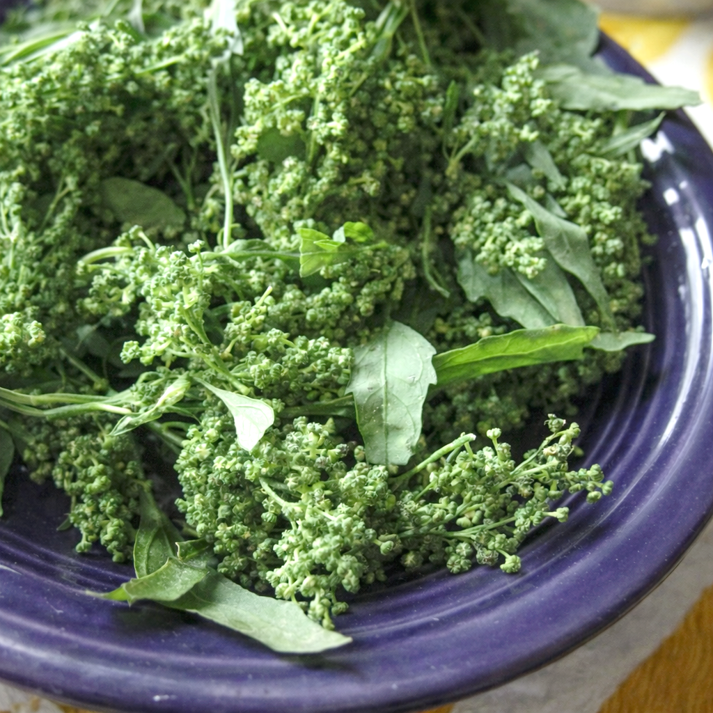 Originaire du Mexique, ce Chénopode comestible (Chenopodium nuttalliae), appelé localement “Huauzontle” est aussi connu sous les noms “Épinard des Aztèques rouge” ou “Brocoli aztèque”. Culture majeure des Mexicains depuis l’époque précolombienne, il figurait parmi les récoltes les plus importantes sous Moctezuma à l’époque aztèque et servait même de tribut. Ses tiges vertes teintées de rouge portent des bouquets de bourgeons, savoureux, entre épinard et jeune brocoli.