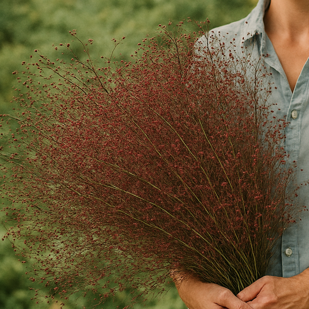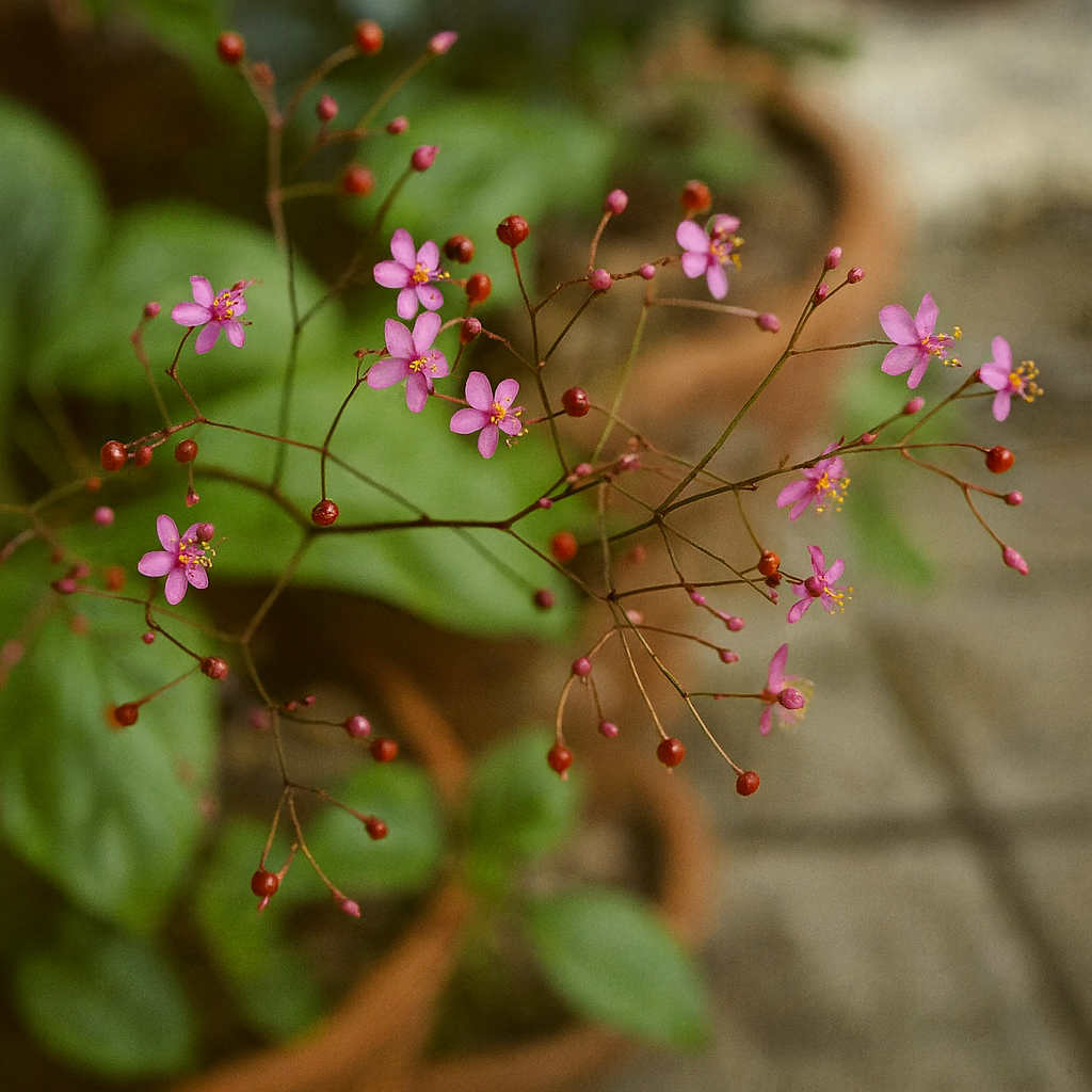 Plante méconnue d’origine tropicale, le Talinum paniculatum, aussi appelé Joyaux ou Bijoux d’Ophar serait cultivé depuis longtemps dans diverses régions chaudes d’Amérique. Il séduit par ses hampes de fleurs rose carmin suivies de capsules cuivrées rappelant de petites pierres précieuses, très prisées pour les bouquets séchés.