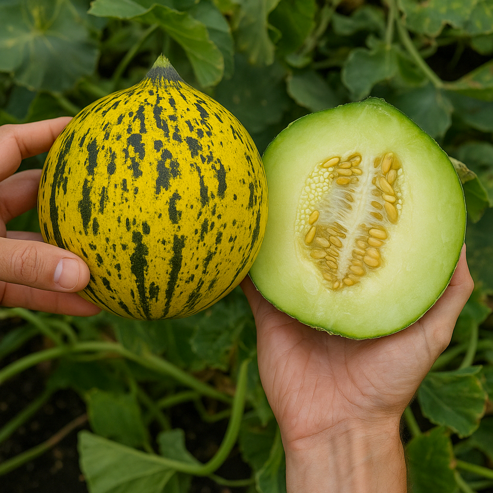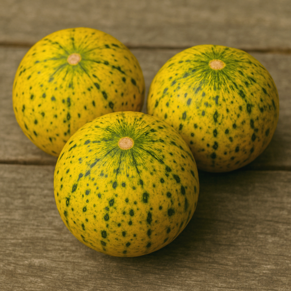Le Melon ‘Turkish Leopard’ est une ancienne variété traditionnelle originaire de Turquie qui appartient au groupe des melons d’hiver de type “Honeydew”, comme le Jaune Canari. Son nom évoque son épiderme jaune crème parsemé de taches vert foncé, à maturité. Ce melon ancien est cultivé depuis longtemps dans les régions chaudes de Turquie, où il est réputé pour sa résistance à la chaleur et sa capacité de conservation exceptionnelle.