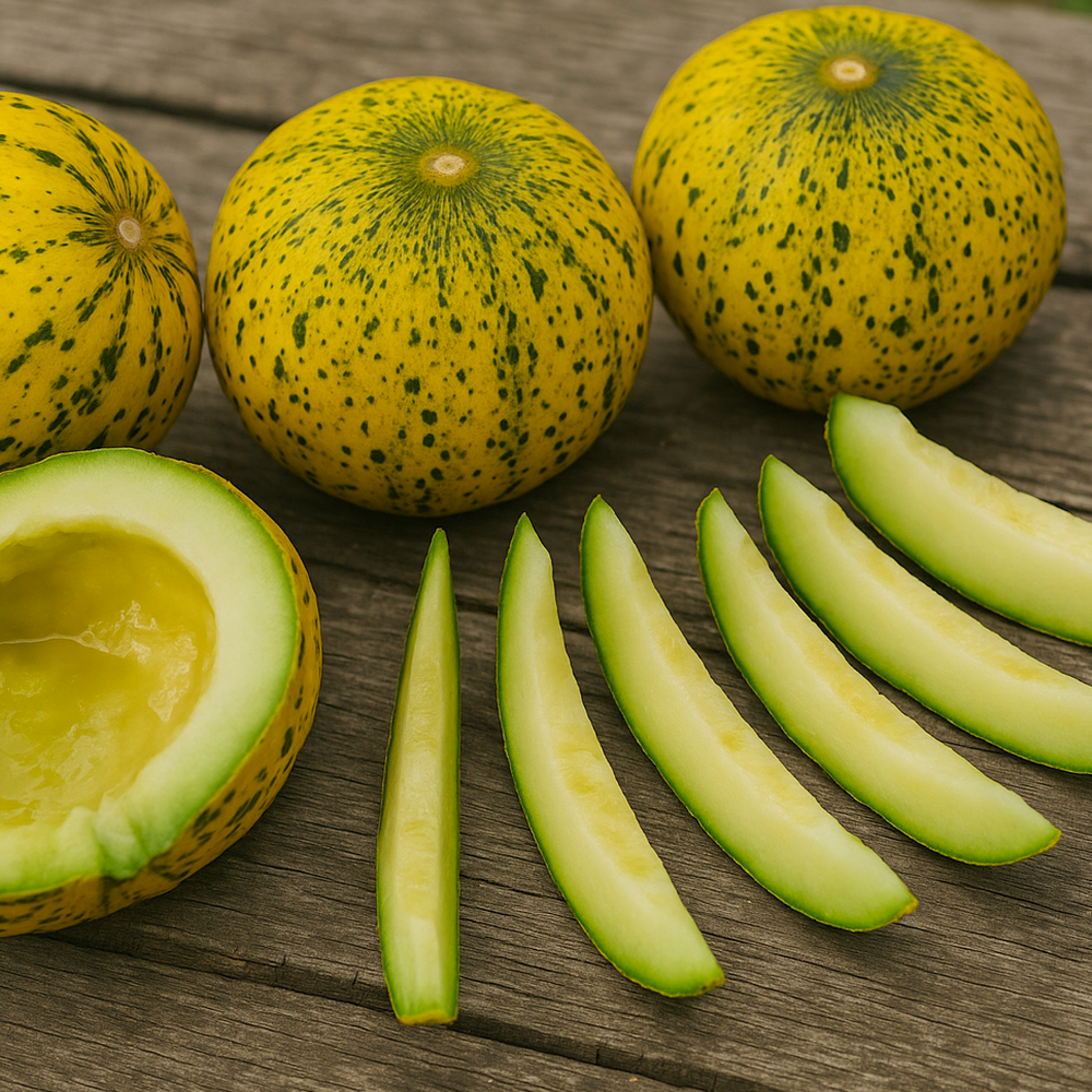 Sa chair vert pâle est fine, très juteuse et dotée d’une saveur sucrée et subtilement fruitée. Sa texture fondante et rafraichissante en font un fruit particulièrement agréable à déguster nature, en salade de fruits ou en dessert frais. Grâce à sa douceur équilibrée, il accompagne aussi parfaitement des mets salés comme le jambon sec ou le fromage de brebis. Récolté à maturité, il se conserve remarquablement bien, parfois jusqu’à la fin décembre, ce qui en fait un melon d’hiver idéal.