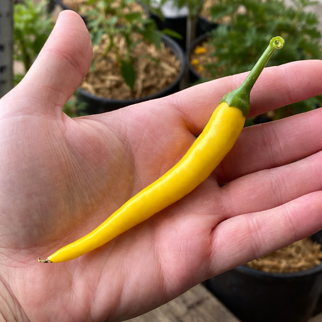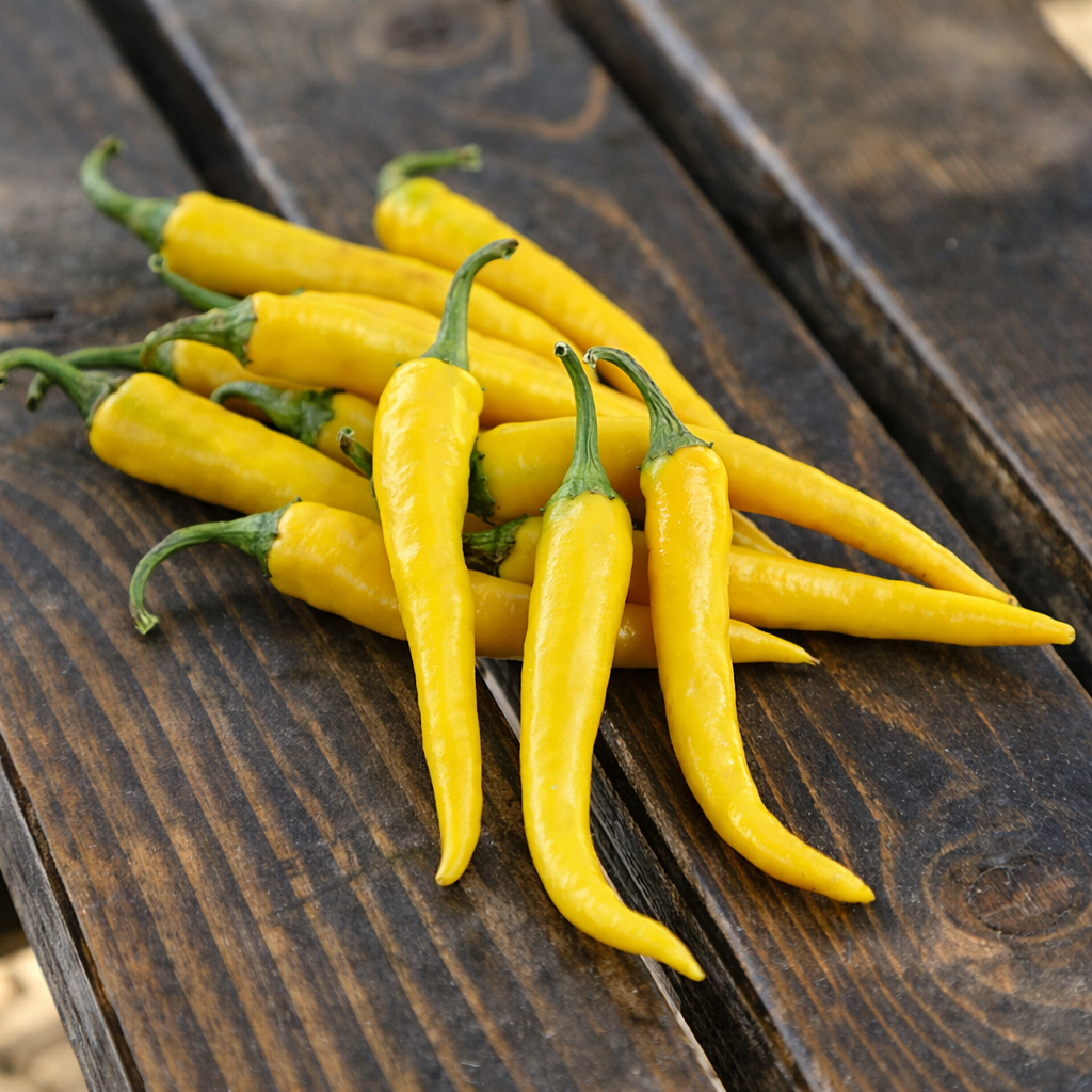 Le piment 'Cayenne Jaune' est une variété version jaune dorée du célèbre piment de Cayenne. Réputé pour sa vigueur et sa productivité, il se distingue par ses fruits légèrement plus longs, plus lisses et plus réguliers. Il est classé très piquant (8/10 sur l’échelle de Scoville). Sa couleur jaune à maturité lui confère un attrait visuel particulier, ajoutant de la luminosité aux plats.