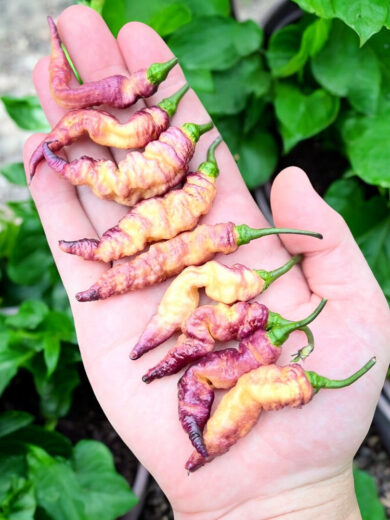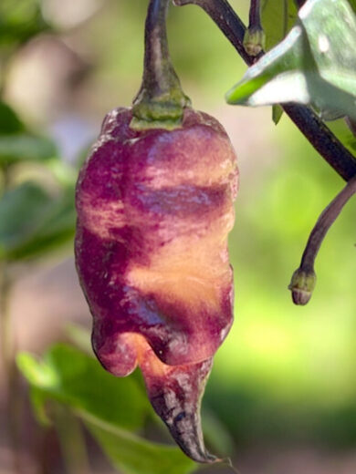 Le piment ‘Thor’s Thunderbolt’ est une variété rare et visuellement saisissante, avec des teintes évoluant du violet, au mauve, puis à la couleur pêche. Son aspect texturé est tout aussi captivant. Bien que son goût soit particulièrement intense, il reste agréable pour les amateurs de piments forts. Noté entre 300 000 et 500 000 unités sur l’échelle de Scoville, et malgré cette chaleur électrisante, il dévoile une saveur fruitée et légèrement sucrée, rappelant celle du piment Ghost. En cuisine, une petite quantité suffit à relever sauces, salsas et plats épicés.