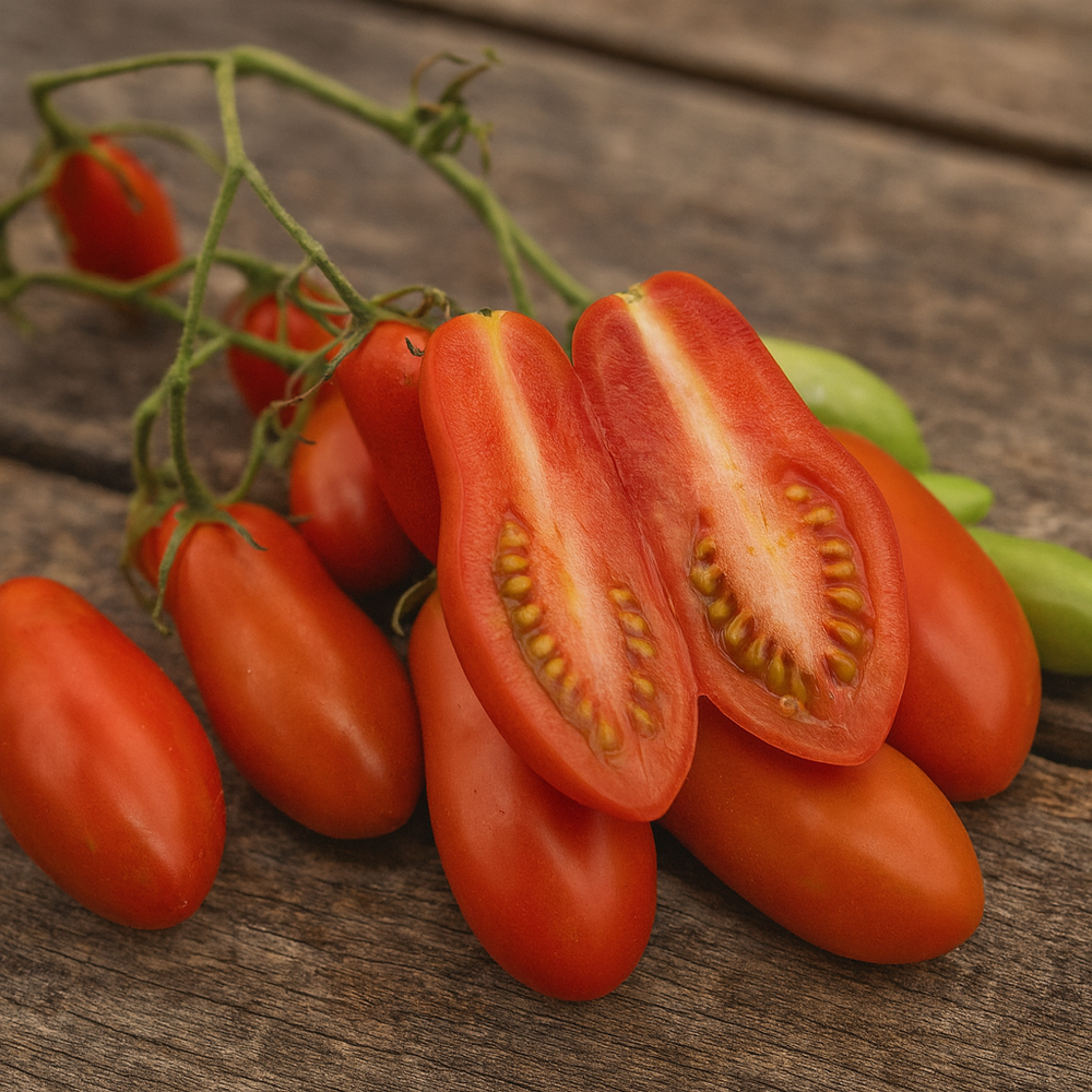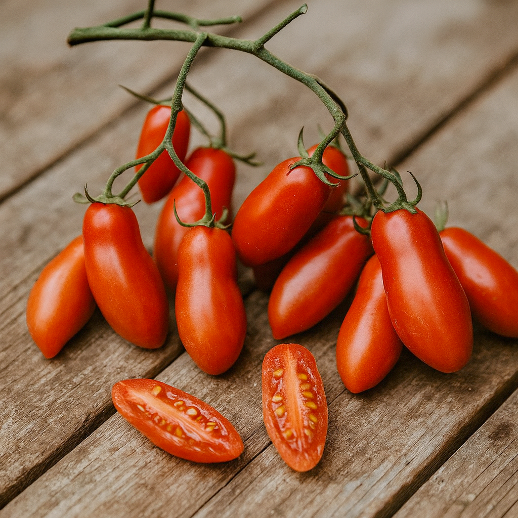 La tomate 'Coucougnette de Vendée', également connue sous le nom de 'Carnica', est une variété mi-précoce originaire d’Allemagne, mais popularisée en France sous ce nom évocateur. Elle se distingue par sa production très généreuse de petits fruits allongés, rouges à reflets rosés, se terminant par une pointe. Ces tomates de type cocktail, pesant entre 15 et 25 grammes, se développent en grappes nombreuses tout au long de la saison, sur des tiges vigoureuses pouvant atteindre jusqu’à trois mètres, donnant à la plante un port de liane à feuillage fin et régulier.