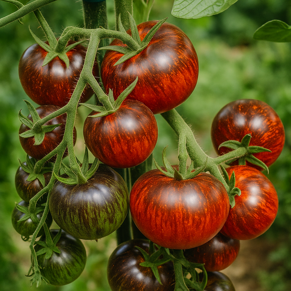 La tomate ‘Dark Galaxy’ est une variété récente née dans les années 2010. Elle s’inscrit dans la lignée des tomates “bleues”, riches en anthocyanes, reconnues autant pour leur esthétique que pour leurs qualités nutritionnelles. Cette variété présente un feuillage dense, légèrement enroulé, et offre des grappes de 10 à 12 fruits à la couleur spectaculaire mêlant vert, pourpre, rouge rouille et éclats dorés, lui donnant l’aspect d’un ciel étoilé, d’où son appellation. Elle séduit par sa grande productivité, sa couleur exceptionnelle et sa saveur !